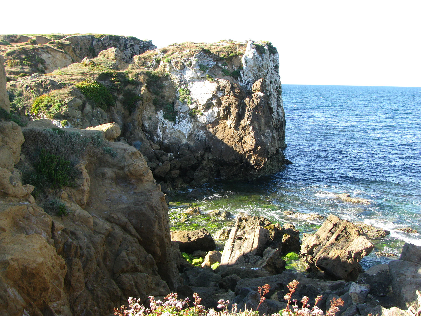 Aikštelėje tik kelios mašinos ir nei vieno žmogaus. Kaip nueiti iki paplūdimio – ženklų nebėra. Yra tik du keliukai : vienas į kairę, kitas į dešinę. Pasirenkam dešinę ir po truputėli leidžiamės žemyn. Keliukas gal tik 20cm pločio ir vinguriuoja tarp samanų ir uolų. Vietomis taip pastatėja, kad reikia leistis keturiom. Ir čia tikrai praverstų kokie kalniniai batai. Po pusvalandžio kabarojimosi prieiname kalno kraštą. Keliukas baigėsi, o iki vandens dar 3-4 metrai žemyn stačia uola. Matyt pasirinkom ne tą pusę. Žmona griežtai pareiškia, kad antrą kartą tiek žemyn nebesikabaros, taigi belieka prisėsti ir pasigerėti vaizdais iš viršaus.