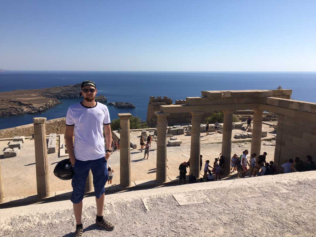 Antroji diena. 9:30 buvau sutaręs jog mus paims motorolerių nuoma. Tikrai galvojau, kad graikai vėluos bent 10 minučių. Tačiau klydau, atvažiavo 10 min ankščiau. Motorolerį buvau rezervavęs per facebook’ą – 5 dienos 100 eur. Supildome dokumentus gauname raktelius, šiokį tokį instruktažą ir pirmyn. Deja, tuom visas gerumas ir baigiasi – neveikia motorolerio spidometras, veidrodėliai nuo kratymosi irgi nusilanksto ir šiaip visiškai netraukia. Mus lenkė apsoliučiai visi – net močiutės, kurios važiavo į bažnyčią… Šiek tiek apsipratę važiuojam į “Tsambika church”, kuri yra įsikūrus ant kalno viršūnės. Deja mūsų motoroleriui ta įkalnė pasirodė per stati, todėl tenka sustoti. Nuo čia teks lipti pėškomis. Po 100 metrų susistabdome belgų porelę, kurie mus užveža iki viršaus. Toliau porą šimtų metrų kopiame pėščiomis. Karštis nežmoniškas, smegeninė jau verda. Tačiau užlipus, vaizdas atperka visus vargus. Apačioje matyti “Tsampika” papludimys – į kurį planavome važiuoti vėliau. Pasigrožėję panorama, leidžiamės žemyn ir važiuojame į pliažą.