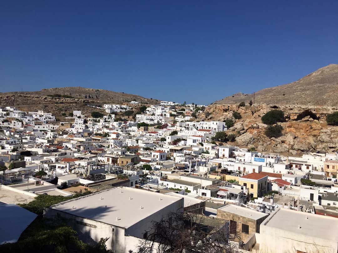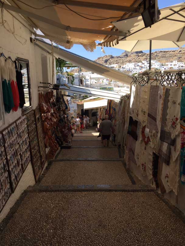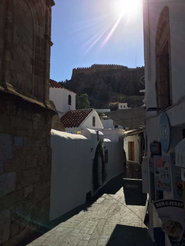Trečioji diena. Kaip ir žadėjome, išvykstame 8 ryto, kai dar karštis proto ribose. Šiandienos tikslas Lindos miestelis, kuris garsėja sniego baltumo nameliais ir antikos laikų akropoliu. Sėdame ant savo mopedėlio ir 40 min birbame iki Lindos miestelio. Motoroleris turi vieną nenuginčijamą privalumą – tai nesunku pasiparkuoti ir nereikia mokėti už stovėjimą. Taigi jau po kelių minučių mes jau einame siauromis senamiesčio gatvelėmis tarp batų namukų. Atrodo, jog čia jau niekas negyvena. Visi namai pavirtę parduotuvėmis arba kavinėmis. Taip siauromis gatvelėmis po truputį kopiame link Lindos akropolio. Nenorintiems eiti pėščiomis, graikai siūloi užnešti su asiliukais. Tačiau eidami peščiomis pamatysite daugiau gražių panoramų, nes asiliukai neša turistus kitu keliu. Įdėjimas į patį akropolį kainuoja 12€ žmogui. Iš tiesų tai ne tiek daug to akropolio ir belikę. Tačiau vaizdai nuo pačio viršaus tikrai verti dėmesio. Apsižvalgome, nusifotografuojame ir keliaujame atgal į miestelį. Visiškai šalia yra smėlėtas lindos paplūdimys, kur mes ir nugriuname keliom valadom.