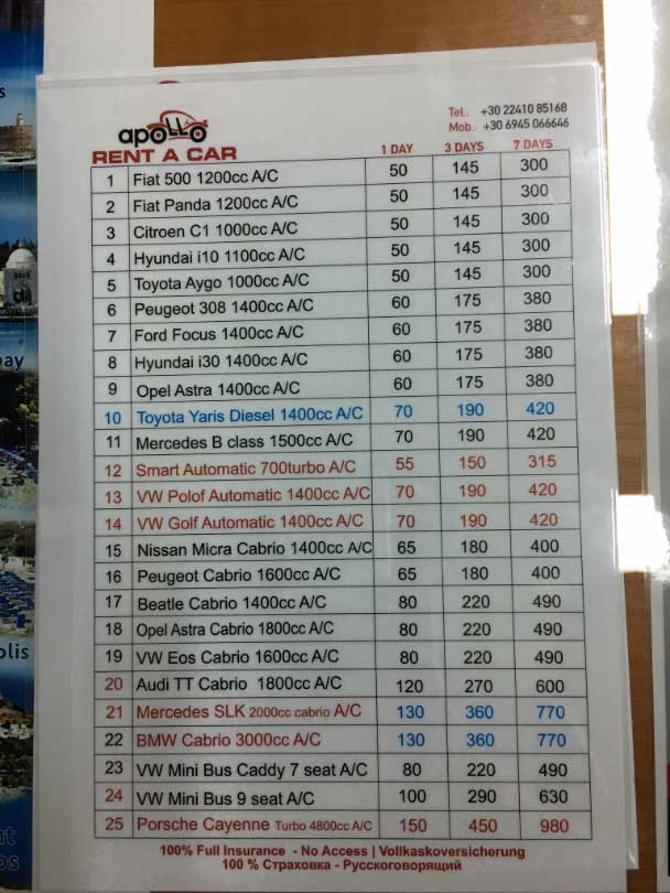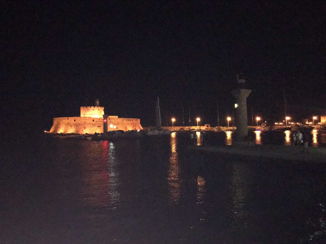 Išsimaudome, pailsime ir keliaujame atsiimti mūsų užsakyto automobilio. Atvykus paprašo palaukti, kol nuplaus. Belaukiant pasirašome visus dokumentus ir gauname raktelius. Deja, čia nutinka vienas juokingas kuriozas. Aš, būdamas nepilnai 2 metrų ūgio, negaliu tilpti į roadster tipo automobilį. Sėdynės čia atsistumia nedaug ir šiaip ne taip susirangęs vidun, negaliu net kojos pajudinti. Auto nuomos šefas pasiūlo išmėginti kitus automobilius. Ir man pavyko įtilpti tik į Nissan Micra cabrio, kuri teoriškai yra keturvietė, tačiau gale telpa tik kuprinė. Ir ta turi būti pustuštė. Taip mūsų trilitris roadsteris pavirto į Nissan Micra kabrioletą. Pasijuokėm visi ir išvažiavom su naujais ratais. Po motorolerio micra jau visai atgaiva. Taigi šį vakarą norime dar kartą aplankyti Rodo miestą ir apžiūrėti, kaip jis atrodo tamsoje. Šokame į pagrindinį kelią ir po keliolikos minučių mes jau senamiestyje. Vėlai vakare automobilį pasistatyti nebuvo sunku. Apeiname pakrantę, senamiestį ir jo apylinkes. Turistų lyg ir nemažai, bet kai kur apsoliučiai tuščia. Vieni barai pilni, kiti visiškai tušti… Pasivaikščioję nusprendžiame, kad mums užteks ir grįžtame namo pajūrio keliu. Reikia pailsėti, nes ryt visą dieną keliausime automobiliu.