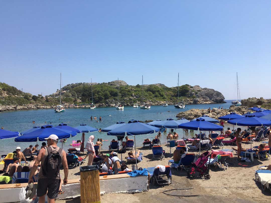Ketvirtoje diena. Vėl atsikeliame anksčiau, kol oras nėra įkaitęs ir važiuojame į “Monastery of Filerimos”, kuris yra įsikūręs ant aukštos kalvos. Šį kartą motoroleris įveikė kalną ir mes jau viršuje. Įėjimas 6 Eurai. Sakyčiau, kad per daug, nes ten nėra ką tiek daug žiūrėti, nebent labai domitės architektūra ar bažnyčiomis. O puikia panorama galima pasigerėti ir aplinkui. Per ilgai neužsisėdim ir važiuojam į “Antony Quinn” pliažą. Tai vienas iš “must-see” pliažų Rodo saloje. Jis visai šalia mūsų miestelio. Nors paplūdimys nėra smėlėtas, tačiau labai gražus. Po vandeniu daugybė uolų – galima nardyti ir grožėtis vietine fauna. Taip pat čia atplaukia nedidelės jachtos ir ekskursijų laiveliai. Oro temperatūra perlipa 35 laipsnius ir iš vandens nebesinori išlipti, neįsivaizduoju, kaip kiti gali gulėti ant gultų visą dieną…. Atėjus pietums, grįžtame namo pailsėti ir atvėsti. O vakarop einame pavakarieniauti. Drąsiai galiu rekomenduoti “Lime Restaurant”. Nors kainos čia yra kiek didesnės, tačiau tik atsisėdus vaišina alyvuogemis su bandele. Mėsos rinkinio dviems manau, kad būtų užtekę ir keturiems. O po valgio dar vaišina šviežiais vietiniais vaisiais. Taip pat čia labai skanūs kokteiliai, kurie gaminami su natūraliais vaisiais.