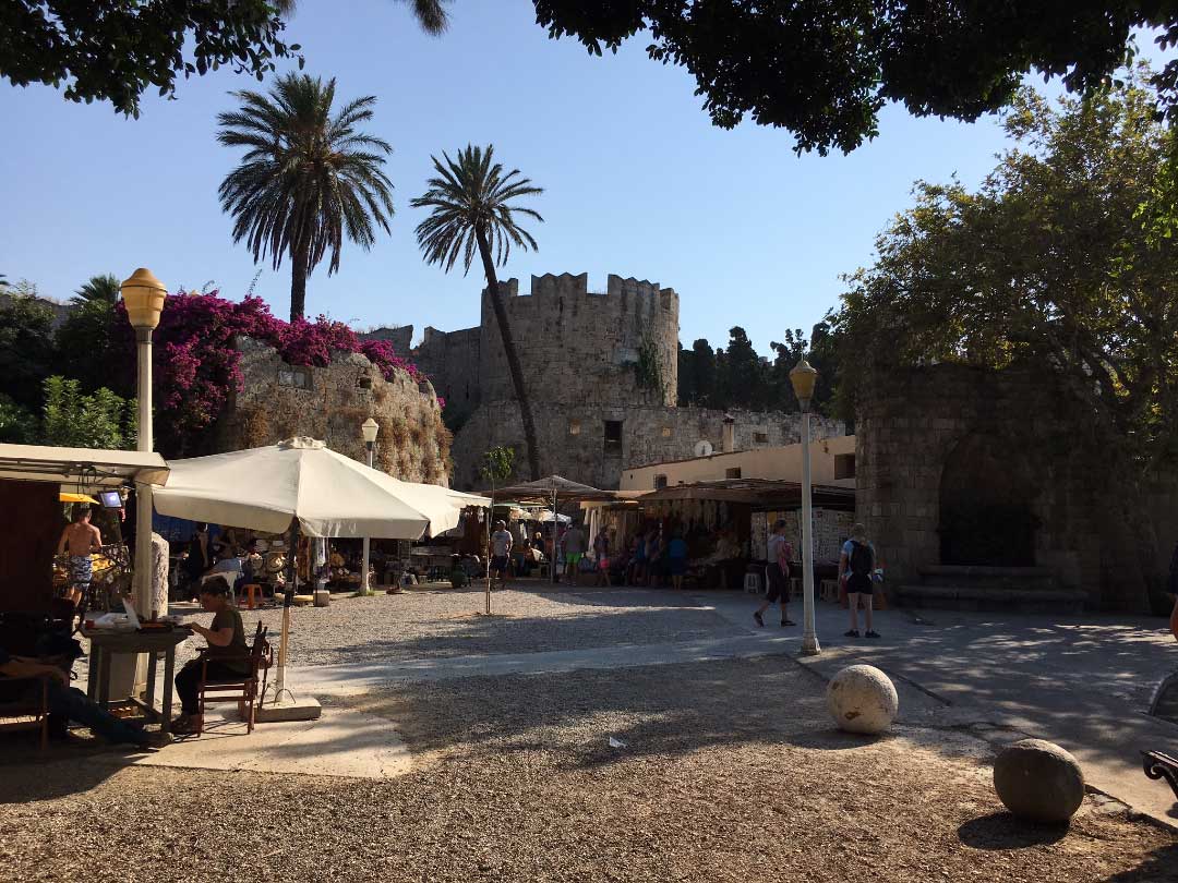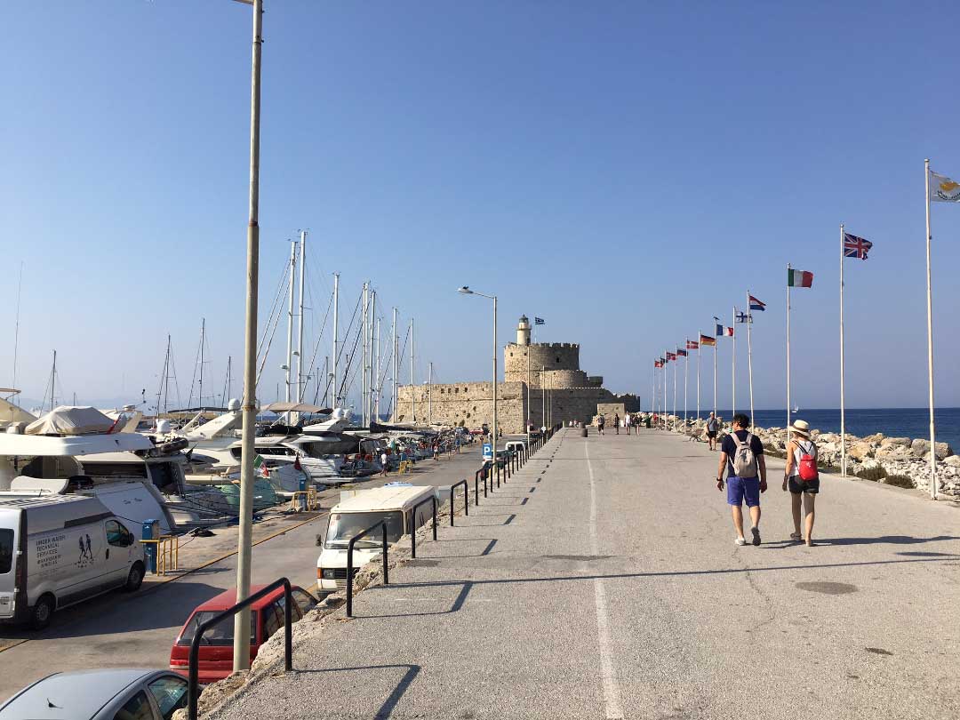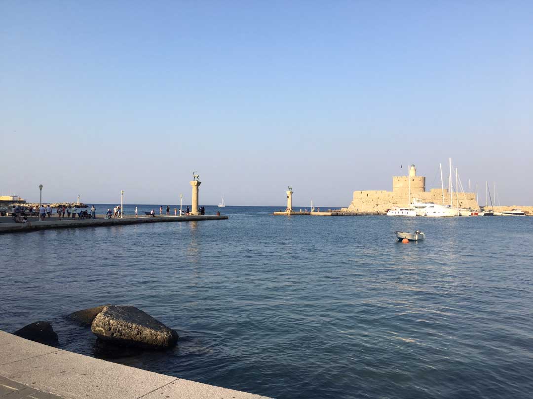 Pirmoji diena. Apie 19:30 nusileidžiame į Rodo oro uostą, kuris randasi “Paradeisi” miestelyje – apie 15 km nuo rodo miesto. Čia mūsų pasų niekas netikrina. Išėję iš oro uosto ieškome autobuso į Rodą. Šalia išėjimo stovi tik taxi ir “transfer” tipo autobusai, todėl nuėjau paklausti, kur rasti visuomeninį transportą. Paeiname šiek tiek tolėliau, palei oro uosto pastatą ir matome atvažiuojanti palūžusį autobusą. Užeinu paklaust, kur autobusas į Rodą, pasirodo, šis autobusas ir važiuos į rodą. Taigi mes pirmieji keleiviai. Dviese susimokam ~5.40€ ir už poros minučių išvažiuojam. Šiek tiek keista, nes visam autobuse tik 3 žmones įskaitant ir mus. Nors mums reikia važiuoti tik 15 km, tačiau kelionė truko apie 40min, nes autobusas stojo visose stotelėse. Pasiekėme Rodą, išlipus pasiteirauju, kaip mums nuvykti į Faliraki miestelį, kuriame mes ir planuojame apsistoti. Čia pat nusiperkame bilietus ~4.80€ ir lipame į kitą autobusą. Šis jau atrodo, kaip tarpmiestinis, netrukus ir pajudame. Faliraki miestelį pasirinkome todėl , kad jis pietinėje salos pusėje, kur daugiausiai smėlėtų paplūdimių. Ir vėl, po 40min, mes jau atvykome. Taigi beliko nukeliauti iki užsakytų apartamentų. Savo naujuosius namus užsisakėme per airbnb, – studijos tipo apartamentai. Prie durų mūsų niekas nelaukia, todėl paskambinu savininkui ir už poros minučių pasirodo senyvo amžiaus pora, kuri aprodo mūsų namus. Kad nenutrokštume, jie mums nupirko vandens, limonado ir vaisių. Žmonės senyvi, bet labai malonūs. Išsipakuojame daiktus ir keliaujame pavalgyti. Tačiau prieš tai dar užsukame į kokteilių barą. Du kokteiliai už vieno kainą. Atrodo neblogai, tik 6eur ir gauni du kokteilius. Aišku skonis nėra tobulas. Naudojamas alkoholis pats pigiausias, o sultys irgi pigios iš tetrapakų. Suvalgom po kebabą ir keliaujam namo. Kelionė padarė savo – jaučiasi nuovargis ir mintyse tik lova…